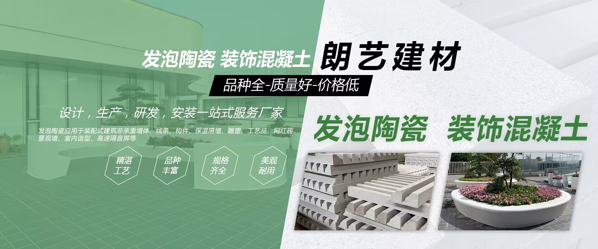 裝飾混凝土、發泡陶瓷實力廠家 成立于2006年,專業從事EPS、GRC、GRG、發泡陶瓷、裝飾混凝土等新型裝飾造型材料的設計、研發、生產和服務的綜合性企業